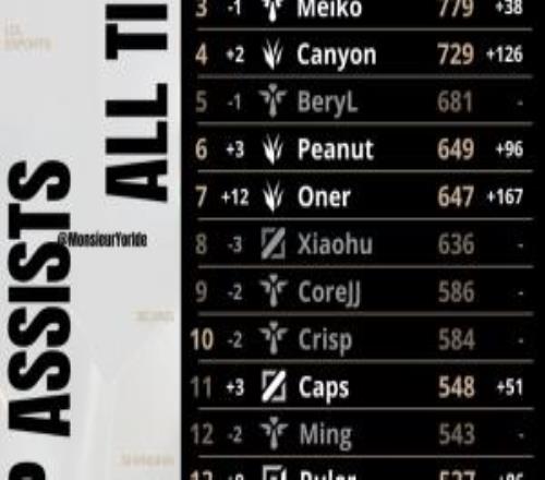 外媒统计全球总决赛最新助攻榜:Faker、Keria有望破千
