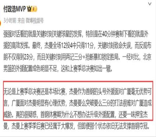 北京记者勇方方直接点名杰曼:一阵消耗太大了,缺人也实在没办法,没有盈骏,赵睿的发挥已经是外援级别,杰曼的问题我不想说了,去年总决赛我发被骂挺惨,我从来没说他不好,只是首钢的目标是冠军。