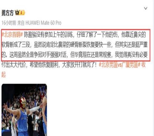 下一场京粤大战,陈盈骏很可能还是打不了,据北京队记勇方方的报道,陈盈骏的鼻骨骨折伤情不是太乐观,靠近鼻尖的软骨断裂成3段,挺严重,29号刚做完手术,目前队医还无法给出明确的复出时间,况且,即便陈盈骏能在明晚火速复出,恐怕在戴上面具后也会影响到手感。